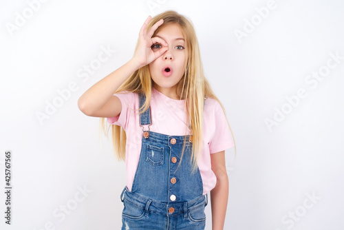 beautiful caucasian little girl wearing denim jeans overall over white background doing ok gesture shocked with surprised face, eye looking through fingers. Unbelieving expression.