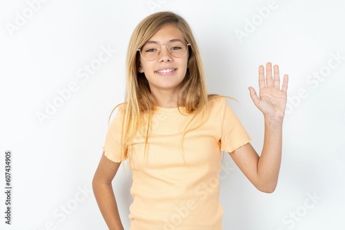 beautiful caucasian teen girl wearing orange T-shirt over white wall waiving saying hello or goodbye happy and smiling, friendly welcome gesture.