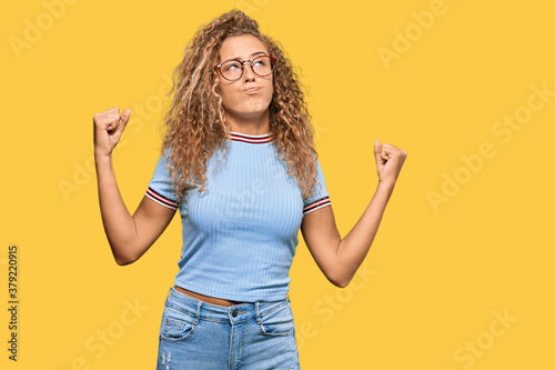 Beautiful caucasian teenager girl wearing casual clothes and glasses showing arms muscles smiling proud. fitness concept.
