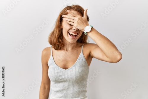 Beautiful caucasian woman standing over isolated background smiling and laughing with hand on face covering eyes for surprise. blind concept.