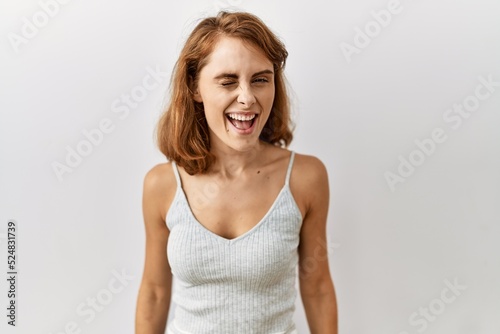 Beautiful caucasian woman standing over isolated background winking looking at the camera with sexy expression, cheerful and happy face.