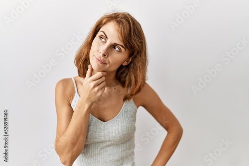 Beautiful caucasian woman standing over isolated background with hand on chin thinking about question, pensive expression. smiling with thoughtful face. doubt concept.