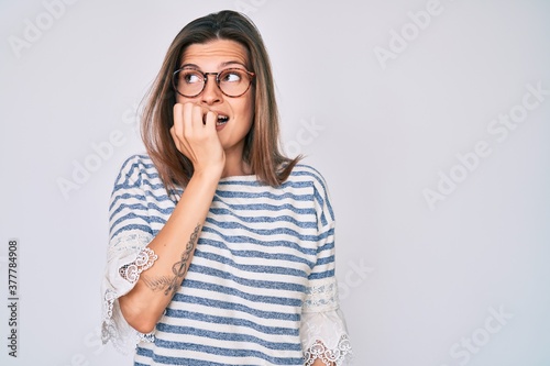 Beautiful caucasian woman wearing casual clothes and glasses looking stressed and nervous with hands on mouth biting nails. anxiety problem.