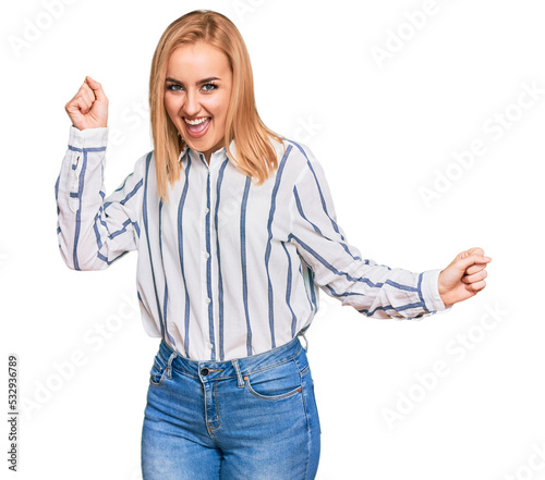 Beautiful caucasian woman wearing casual clothes dancing happy and cheerful, smiling moving casual and confident listening to music