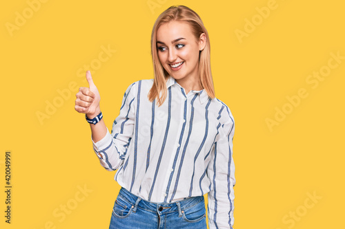 Beautiful caucasian woman wearing casual clothes looking proud, smiling doing thumbs up gesture to the side