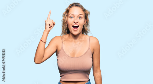 Beautiful caucasian woman wearing casual clothes pointing finger up with successful idea. exited and happy. number one.