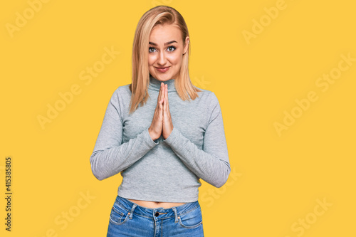 Beautiful caucasian woman wearing casual clothes praying with hands together asking for forgiveness smiling confident.