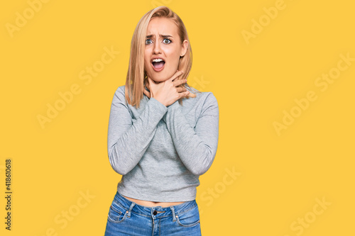Beautiful caucasian woman wearing casual clothes shouting and suffocate because painful strangle. health problem. asphyxiate and suicide concept.