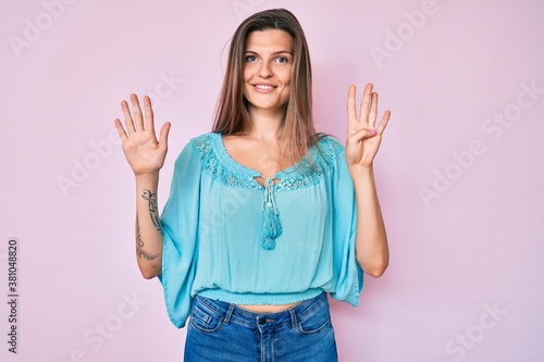 Beautiful caucasian woman wearing casual clothes showing and pointing up with fingers number nine while smiling confident and happy.