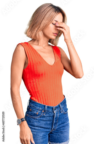 Beautiful caucasian woman wearing casual clothes tired rubbing nose and eyes feeling fatigue and headache. stress and frustration concept.