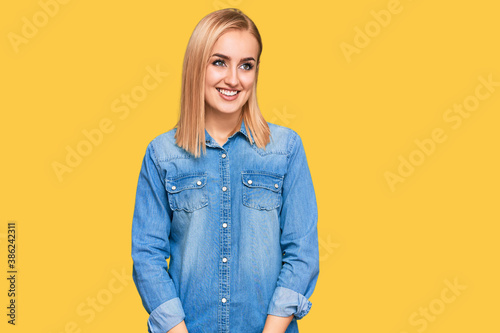 Beautiful caucasian woman wearing casual denim jacket looking away to side with smile on face, natural expression. laughing confident.