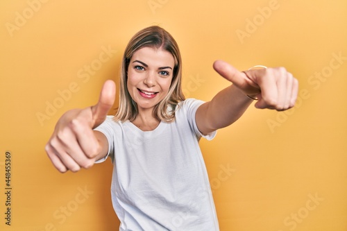 Beautiful caucasian woman wearing casual white t shirt approving doing positive gesture with hand, thumbs up smiling and happy for success. winner gesture.