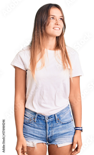 Beautiful caucasian woman wearing casual white tshirt looking away to side with smile on face, natural expression. laughing confident.