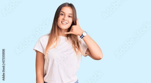 Beautiful caucasian woman wearing casual white tshirt smiling doing phone gesture with hand and fingers like talking on the telephone. communicating concepts.