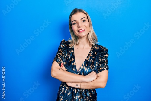Beautiful caucasian woman wearing elegant party dress happy face smiling with crossed arms looking at the camera. positive person.