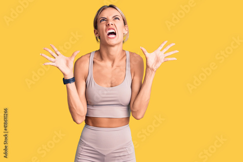 Beautiful caucasian woman wearing sportswear crazy and mad shouting and yelling with aggressive expression and arms raised. frustration concept.