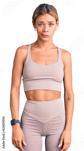 Beautiful caucasian woman wearing sportswear depressed and worry for distress, crying angry and afraid. sad expression.