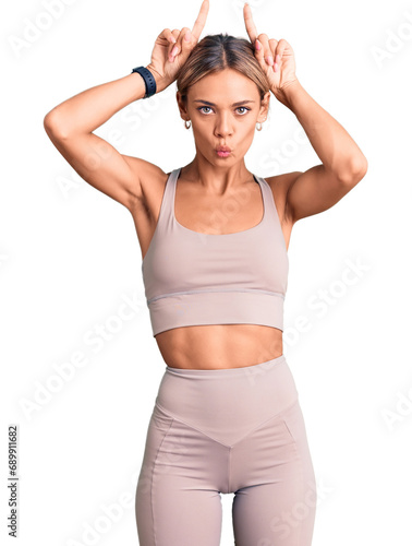 Beautiful caucasian woman wearing sportswear doing funny gesture with finger over head as bull horns