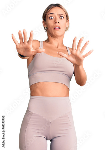 Beautiful caucasian woman wearing sportswear doing stop gesture with hands palms, angry and frustration expression