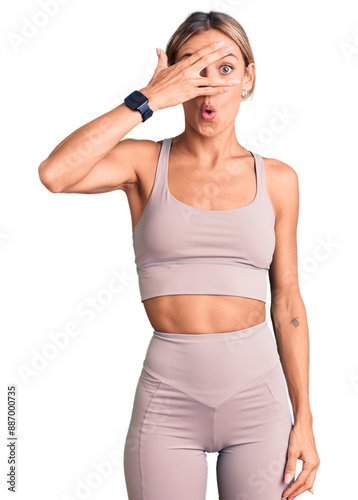 Beautiful caucasian woman wearing sportswear peeking in shock covering face and eyes with hand, looking through fingers with embarrassed expression.