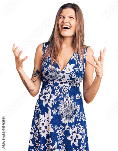 Beautiful caucasian woman wearing summer dress crazy and mad shouting and yelling with aggressive expression and arms raised. frustration concept.