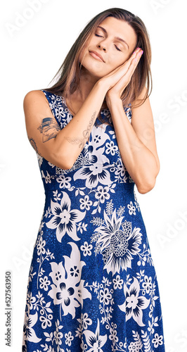 Beautiful caucasian woman wearing summer dress sleeping tired dreaming and posing with hands together while smiling with closed eyes.