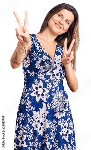 Beautiful caucasian woman wearing summer dress smiling looking to the camera showing fingers doing victory sign. number two.