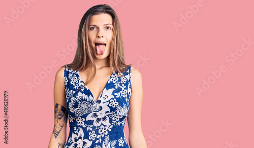 Beautiful caucasian woman wearing summer dress sticking tongue out happy with funny expression. emotion concept.