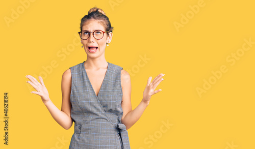 Beautiful caucasian woman with blonde hair wearing business clothes and glasses crazy and mad shouting and yelling with aggressive expression and arms raised. frustration concept.