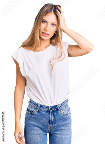 Beautiful caucasian woman with blonde hair wearing casual white tshirt confuse and wonder about question. uncertain with doubt, thinking with hand on head. pensive concept.