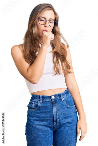 Beautiful caucasian young woman wearing casual clothes and glasses feeling unwell and coughing as symptom for cold or bronchitis. health care concept.