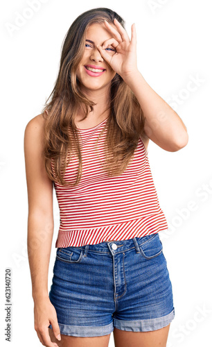 Beautiful caucasian young woman wearing casual clothes doing ok gesture with hand smiling, eye looking through fingers with happy face.