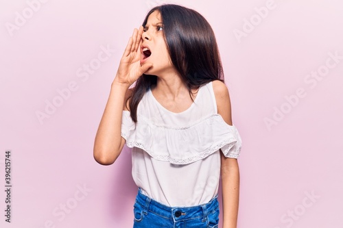 Beautiful child girl wearing casual clothes shouting and screaming loud to side with hand on mouth. communication concept.