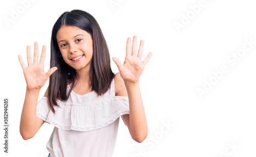 Beautiful child girl wearing casual clothes showing and pointing up with fingers number ten while smiling confident and happy.