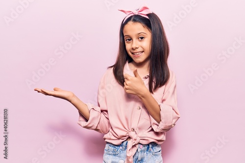 Beautiful child girl wearing casual clothes showing palm hand and doing ok gesture with thumbs up, smiling happy and cheerful