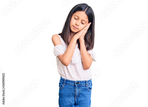 Beautiful child girl wearing casual clothes sleeping tired dreaming and posing with hands together while smiling with closed eyes.