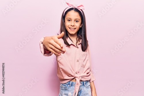 Beautiful child girl wearing casual clothes smiling friendly offering handshake as greeting and welcoming. successful business.