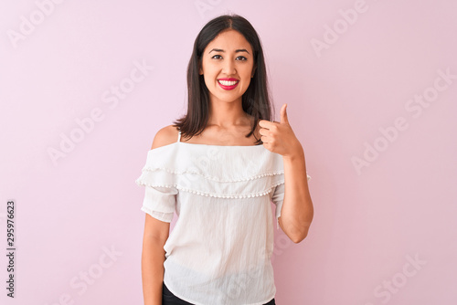 Beautiful chinese woman wearing white t-shirt standing over isolated pink background doing happy thumbs up gesture with hand. Approving expression looking at the camera showing success.