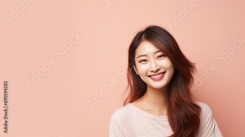 Beautiful confident Asian female in colorful sweater smile and cheerful standing against plain background, happy freelance or designer worker woman looking camera healthy face, long curly hairstyle