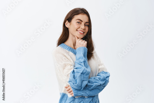 Beautiful confident girl holding hand on chin and smiling at camera with coquettish look, standing in sweater, thinking with pensive face expression, white background