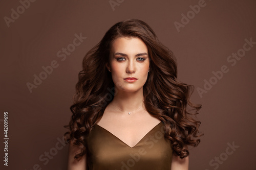 Beautiful curly hair model. Woman with wavy long hairstyle portrait. Volume