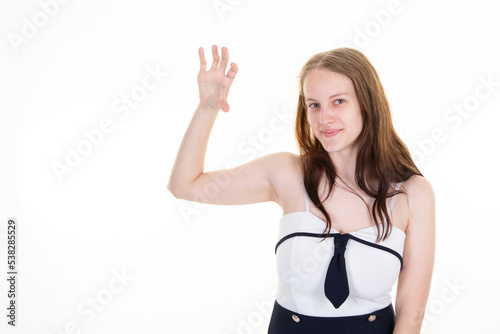 Beautiful cute woman presents a virtual card blank with empty fingers next to copy space on white background