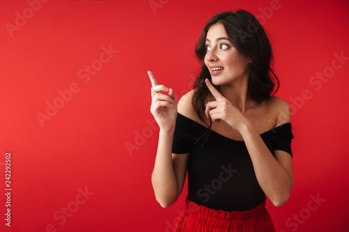 Beautiful cute young woman standing isolated over red wall background pointing.