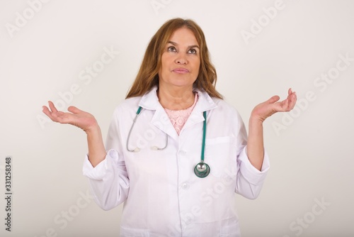 Beautiful doctor woman doubt expression, confuse and wonder concept, uncertain future shrugging shoulders, standing against gray Wall.