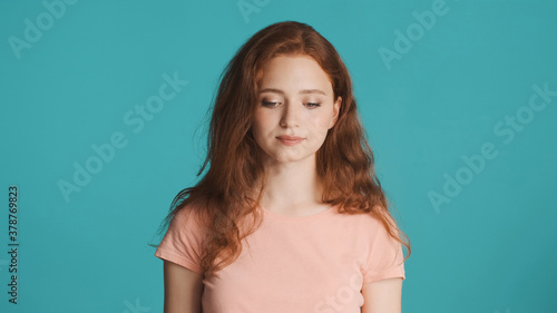 Beautiful dreamy girl closing eyes on camera over colorful background