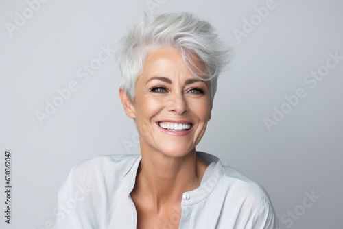 Beautiful elderly senior woman, model, woman with grey hair laughing and smiling into camera, old lady portrait, skin care, cosmetics, dental, beauty, generative ai