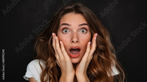 Beautiful excited blonde female covers eyes with happiness, doesnt expect to recieve pleasant surprise from close friend, being thankful and pleasantly shocked, isolated over black background