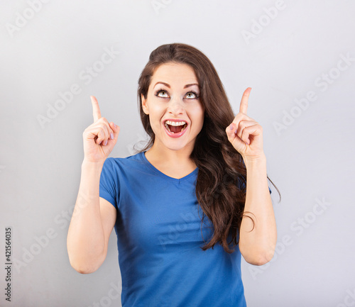 Beautiful excited casual woman pointing the fingers up with toothy smiling on empty copy space blue background. Closeup