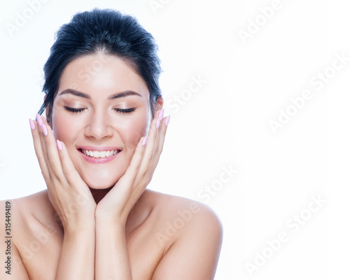 Beautiful face of young adult woman with clean fresh skin - isolated on white