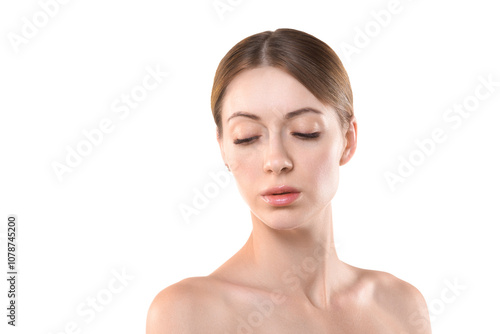 Beautiful female face with closed eyes and hair up, smooth skin and bare shoulders, isolated on white. Young Caucasian woman portrait.